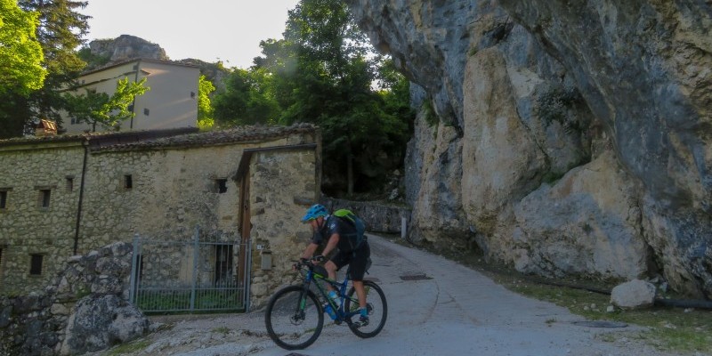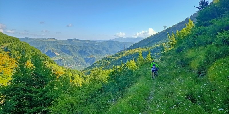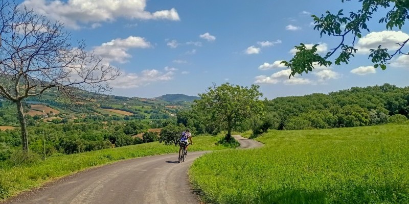 Con una breve risalita si imbocca il secondo tratto di discesa, in gran parte sul sedime di una vecchia mulattiera ora ridotta a sentiero: il punto più complicato arriva quasi subito, nell’attraversamento non ciclabile del Fosso di San Giacomo (cinque minuti a piedi), successivamente la traccia scende a Cerqueto rimanendo quasi sempre ciclabile ma con alcuni brevi passaggi esposti.