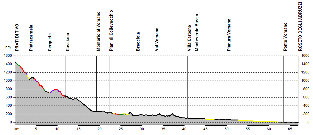 La tappa conclusiva può essere divisa in due: prima la complicata discesa su Montorio, quindi il lunghissimo tratto a fianco del fiume Vomano costellato da qualche breve salita prima dell’arrivo sul lungomare di Roseto degli Abruzzi.
