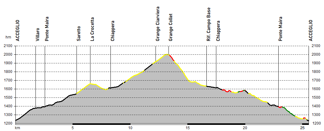 Ad Acceglio inizia la lunga ma discontinua salita verso le quote più alte della vallata, con il primo chilometro fino a Villaro che si rivela anche il più impegnativo; la scalata prosegue poi più agevole fino a Saretto dove devia a destra sullo sterrato per La Crocetta.