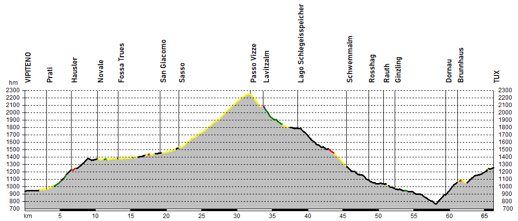 Si giunge così alla risalita conclusiva verso Tux: i primi chilometri verso Dornau e Brunnhaus sono i più difficoltosi, mentre dopo un intermezzo sterrato si procede con pendenze più agevoli rimanendo sulla strada principale di fondovalle. Facendo attenzione ad alcune gallerie si arriva quindi a Tux con un ultimo tratto nel bosco.