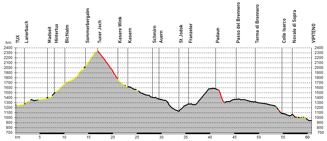 I primi chilometri in falsopiano lungo il torrente Tux permettono di spingersi fino a Hintertux, nel lembo sud-occidentale della Zillertal, ai piedi del ghiacciaio di Hintertux: l’imponente nevaio ospita l'unico comprensorio sciistico dell'Austria aperto tutto l'anno e farà da scenario alla prossima dura salita.