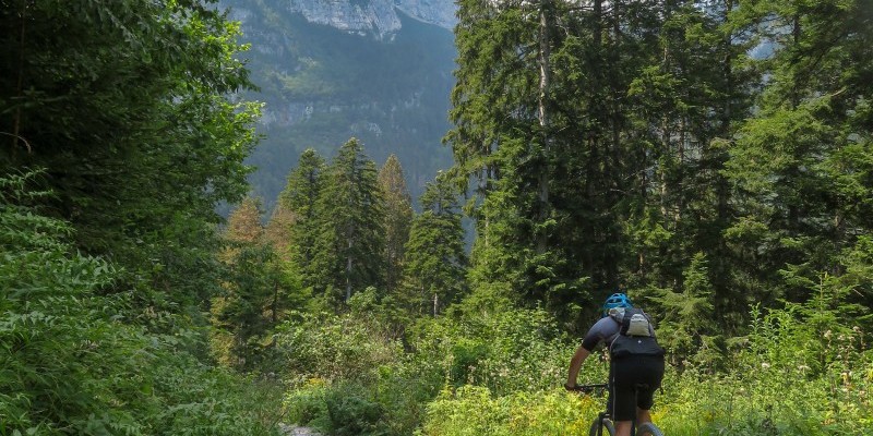 Si sale ora nel bosco con pendenze pedalabili fino a un tornante sinistrorso nei cui pressi si abbandona lo sterrato imboccando l’ “Udes’s Trail”: sebbene in passato abbia ospitato competizioni enduro, il sentiero si presenta non eccessivamente tecnico scendendo gradualmente al Pra dal Sass. Qualche breve passaggio più difficile si incontra solo nella seconda parte, quando il single track rimane affiancato alla strada forestale che rappresenta una alternativa più facile alla discesa.