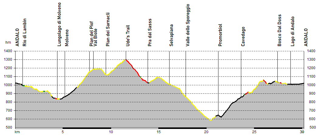 Un tour che tocca tre dei paesi dell’Altopiano della Paganella (Andalo, Molveno e Cavedago), snodandosi dal lago di Molveno ai boschi di Selvapiana e affrontando il tecnico Ude’s Trail.