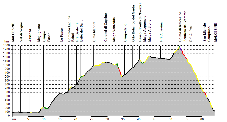 Un tour avventuroso, panoramico ed estremo che permette di salire da Malcesine alla cima del monte Baldo senza utilizzare la ben più comoda funivia: il prezzo da pagare in termini di sforzo fisico sarà però alto, viste le pendenze spesso estreme delle salite e i tratti molto tecnici incontrati nelle discese.