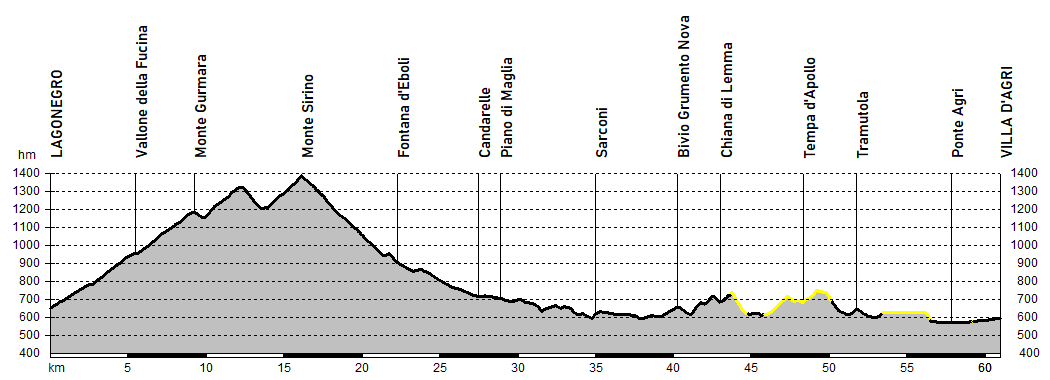 La tappa si apre con le dolci pendenze della Provinciale Lagonegrese che permettono di guadagnare agevolmente quota fino al bivio per il monte Sirino: la salita prosegue ora più discontinua, con tre scollinamenti in serie che consentono di arrivare nelle vicinanze del monte Sirino.