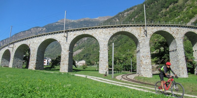 Il grazioso centro storico di Poschiavo segna la fine delle difficoltà: con un lungo tratto pianeggiante si pedala infatti sugli argini del rio Poschiavino e sulle sponde del lago di Poschiavo fino al punto panoramico di MIralago, prima di riprendere la discesa verso Tirano percorrendo strade secondarie e tratturi boschivi tra i quali spunta – a sorpresa poco prima della frontiera italiana – il passaggio ai piedi del caratteristico viadotto elicoidale di Brusio.