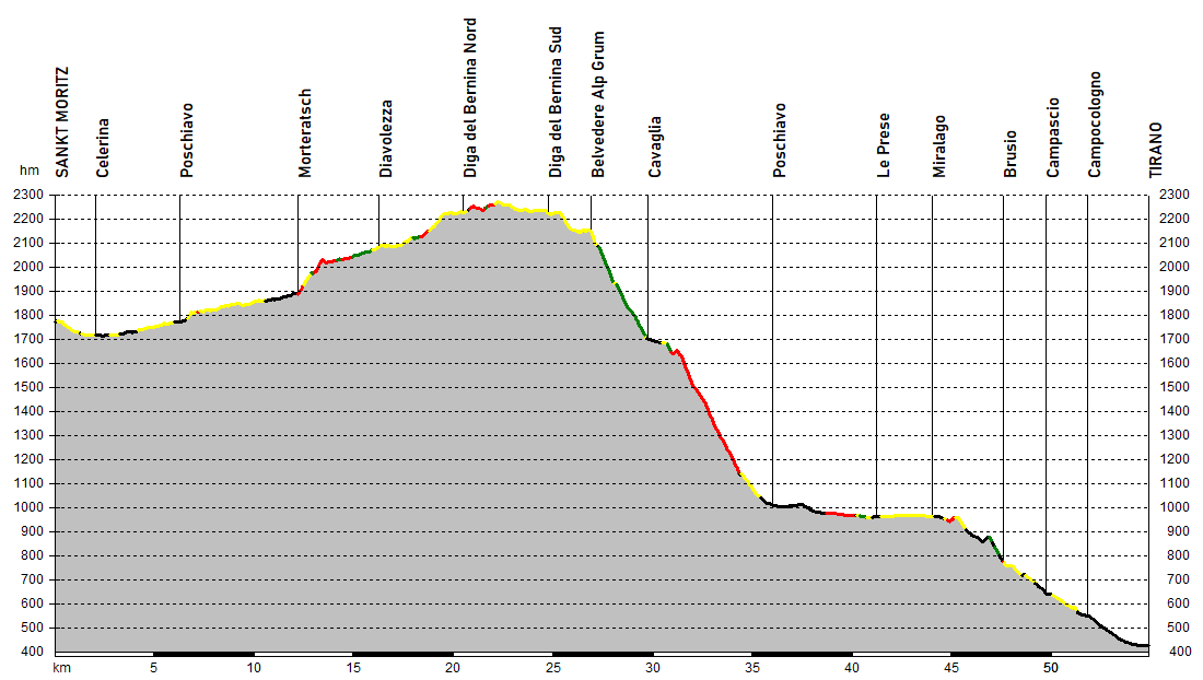 Il tratto che passa Pontresina e arriva a Morteratsch, ai piedi dell’omonimo ghiacciaio e del Piz Bernina, è molto facile e percorre in leggerissima ascesa ciclabili e piste forestali spesso affiancate alla linea ferroviaria; più arcigne sono invece le rampe del sentiero che lambisce le cascate del Bernina, supera quota 2000 metri e raggiunge i vasti prati di Suot proseguendo poi su pendenze agevoli verso le funivie di Diavolezza e Lagalb.