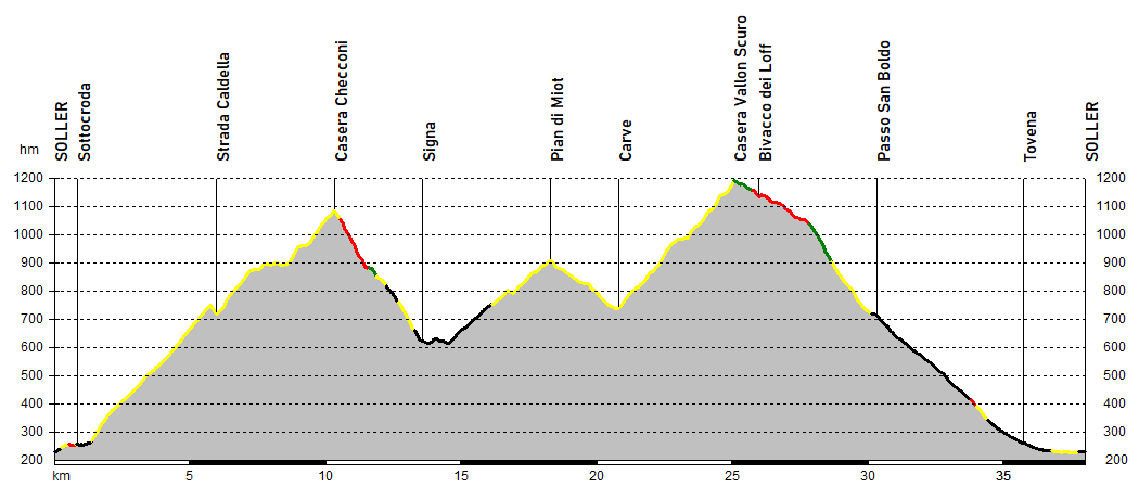 Da Soller si raggiunge Sottocroda salendo poi una sterrata dai numerosi tornanti e dalle modeste pendenze fino ad immettersi sull’impegnativa Strada della Caldella, decisamente più ripida e malmessa; un interlocutorio tratto più pedalabile anticipa quindi l’erta conclusiva alle pendici del Monte Cimone.
