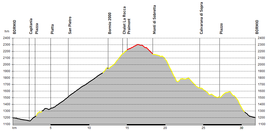 Da Bormio si discende la vallata fino alla frazione di Capitania, imboccando poi la regolare salita per Piazza; d’improvviso l’ascesa si fa però più difficile, continuando su fondo cementato talvolta ripidissimo fino alla borgata di Piatta.