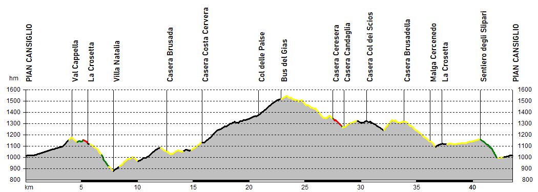 L’itinerario, che tocca entrambi questi luoghi, parte dal centro della Piana del Cansiglio addentrandosi poi in Val Cappella, raggiungendo il valico La Crosetta con una serie d sentieri non sempre ciclabili. Una ripida e insidiosa discesa conduce quindi alla strada provinciale.