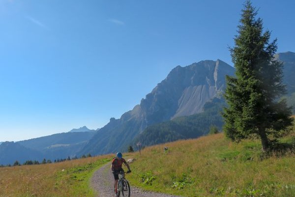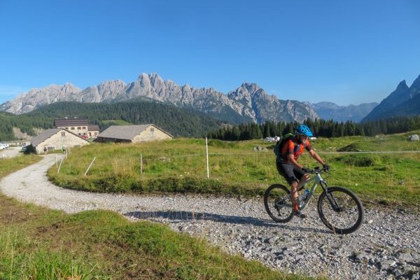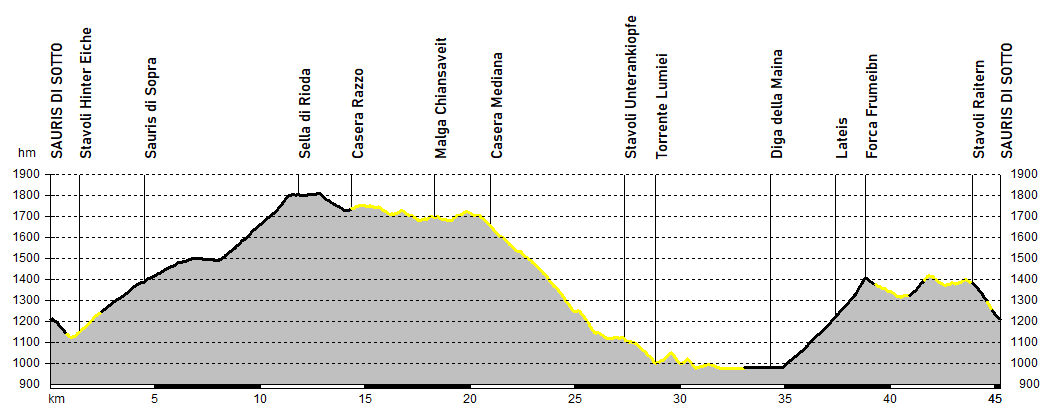 Il punto di partenza dista da qui solo quattro chilometri di salita a media pendenza: in alternativa, l’itinerario affronta la dura salita di Lateis continuando su fondo cementato ancor più ripido fino a Forca Frumeibn; pedalando sempre nel bosco si aggira quindi il monte Olbe, si supera il canalone del Rio Mitreichen e si scende infine a Sauris di Sotto lungo le piste da sci.