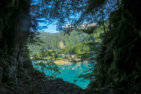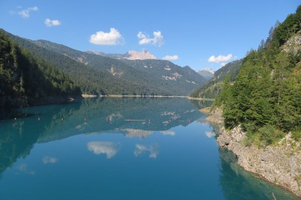 Le acque cristalline dello specchio d’acqua fanno ora capolino tra gli alberi nei saliscendi che vanno a innestarsi sulla strada del passo Pura; una suggestiva galleria scavata nella roccia sbuca poi direttamente sulla diga della Maina, attraversata la quale ci si sposta sul versante nord della valle.