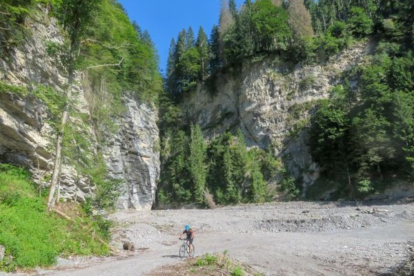 Una lunga discesa nel bosco si addentra ora nella valle del Lumiei con tratti ripidi, diversi tornanti e qualche punto smosso; dopo il primo attraversamento del corso d’acqua la strada forestale diventa più compatta arrivando al successivo guado, giusto ai piedi delle pareti di roccia che incanalano il torrente poco prima dell’immissione nel lago di Sauris.