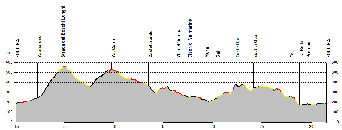 sterrati della valle del Ruio e della Via dell'Acqua: con alcuni punti tecnici si raggiunge quindi Cison di Valmarino, spostandosi poi sul