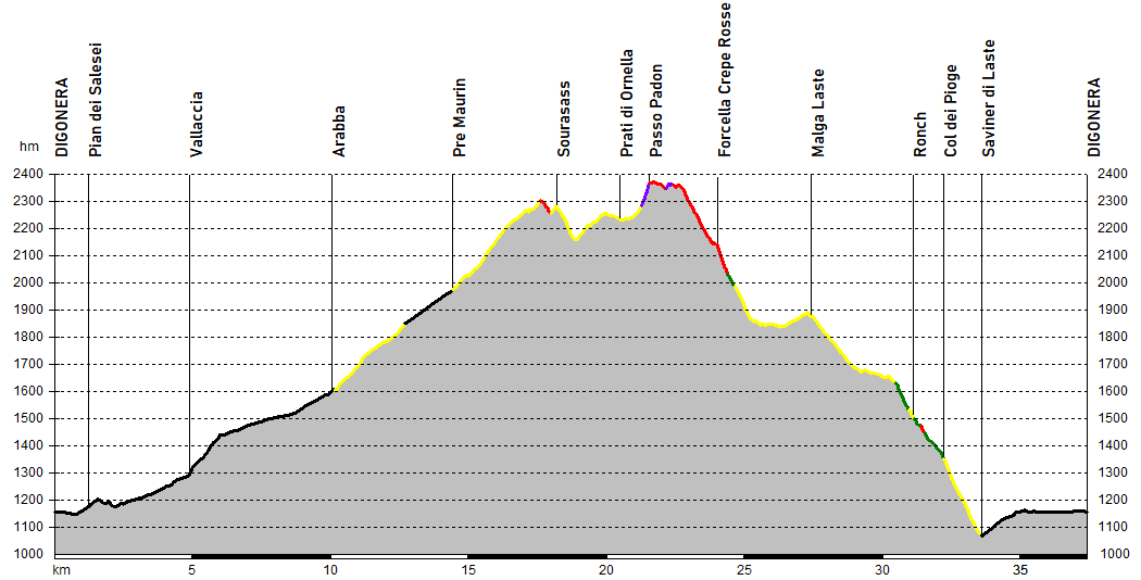 Da Digonera si risale la valle del Cordevole con pendenze impegnative solo nel duro strappo di Vallaccia, arrivando infine ad Arabba; si continua ora all’ombra del gruppo del Sella sulle sterrate che risalgono verso il Pordoi, percorrendo alcuni tornanti in asfalto e deviando poi sulla ripida mulattiera che raggiunge la maestosa quinta del Surasass.