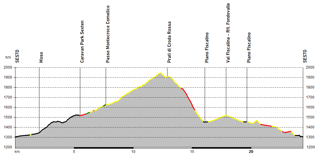 versante destro della valle. Interrotta da alcune brevi discese, la salita continua poi più dolce sul segnavia 13A che oltrepassa il Caravan Park Sexten (single track e qualche passo a piedi) giungendo poi in vista del Passo Montecroce