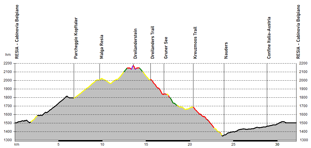 Qui tre diverse panchine, una sul territorio di ogni nazione, permettono di rifiatare ammirando la sottostante valle dell’En prima di ritornare per lo stesso sentiero dell’andata alla biforcazione. Ben presto si sconfina in Austria incontrando il Dreilander Trail, uno dei tanti percorsi del comprensorio di Nauders, che scende con passaggi divertenti al Grunsee (lago Verde).
