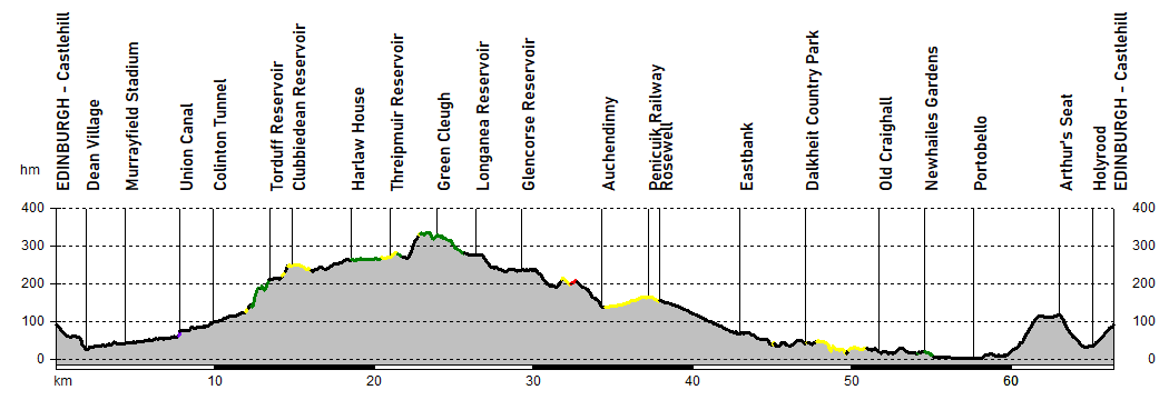 Il parco di Dalkeith, gli sterrati lungo il fiume Esk e i giardini di Newhailes sono le tappe che conducono al mare, costeggiato sull’iconica Promenade di Portobello Beach. Si affrontano quindi le ultime due salite del tour: la prima sale tra i quartieri residenziali fino all’Arthur’s Seat, la montagna di Edinburgo dalla quale si ammira un superbo panorama sulla città; la seconda invece percorre tutto il Royal Mile dal palazzo di Holyrood verso Castlehill toccando i siti più rappresentativi della capitale scozzese.