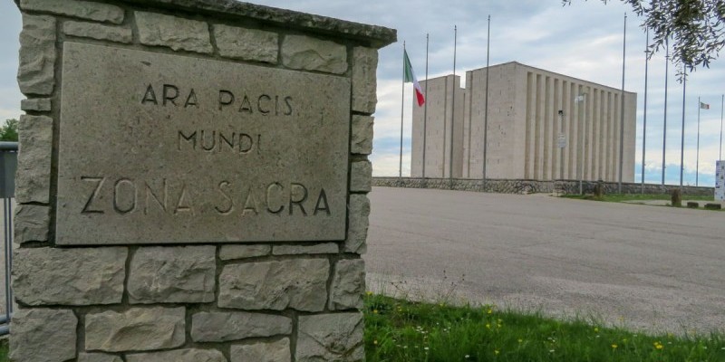 Si va ora a scalare la facile erta del Colle di Medea, l’altura che si erge isolata nel mezzo della fetta di terra tra i due fiumi: sulla sua sorge l’Ara Pacis Mundi, il monumentale tempio in memoria dei caduti di tutte le guerre.