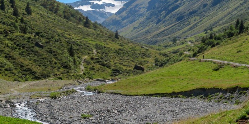Dal centro di Galtür si imbocca la Jamtalstraße che con un primo tratto di ripida salita va ad affiancare il corso del torrente Jambach; le pendenze ora calano, con l’ascesa che prosegue dolce e panoramica addentrandosi nell’idilliaca Jamtal, una valle glaciale circondata da cime imponenti come il Dreiländerspitze e l’Augstenberg.