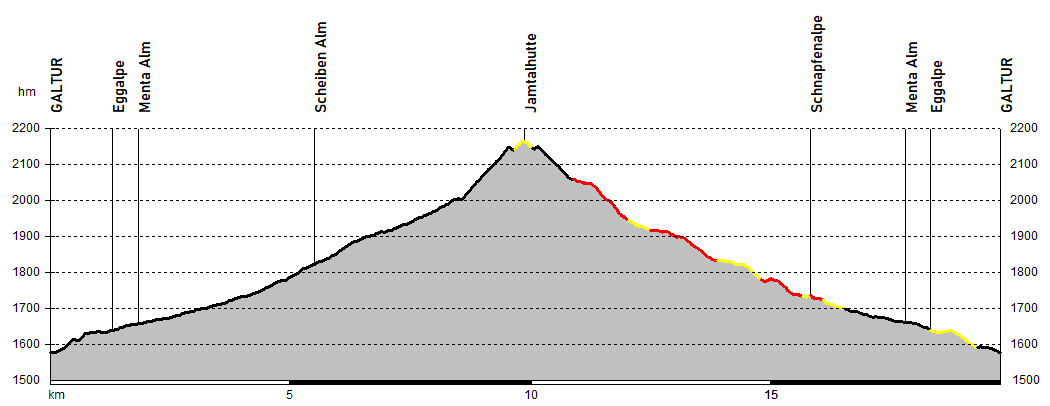 Durante la salita asfaltata – sempre fuori e in molti tratti disastrata - si attraversano prati alpini, pascoli e piccoli ponti in legno, con continui punti panoramici per brevi soste. Le pendenze si fanno via via più accentuate culminando dopo il ponte di quota 2000 metri, dove l’ultimo ripido chilometro arriva al Rifugio Jamtalhütte che offre ristoro, cucina tipica tirolese e una splendida vista sul ghiacciaio Jamtalferner.