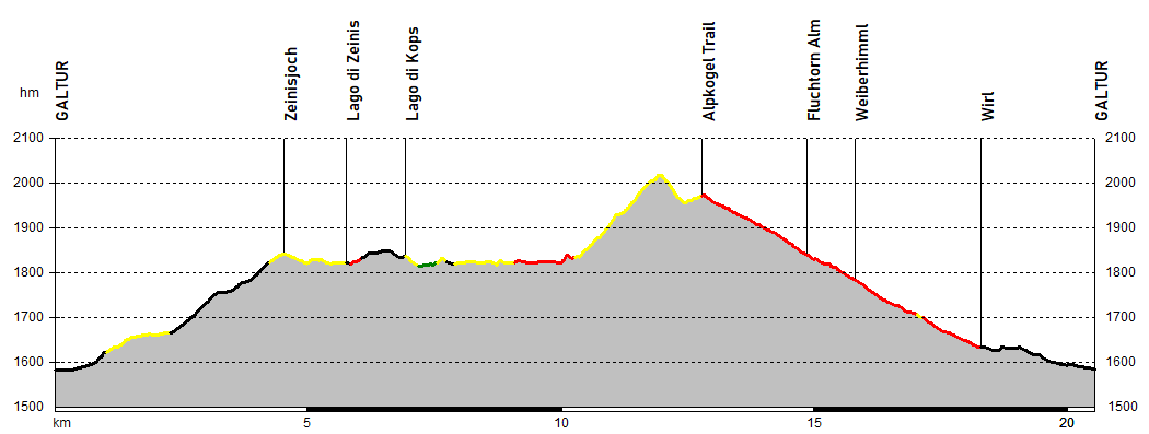Nel fondo della valle di Paznaun Galtur segna l'inizio della scalata al passo Zeinis, spartiacque dei bacini idrografici del Rodano e del Danubio: subito un primo strappo immette sullo sterrato panoramico di Wirl, da dove con altri due chilometri si arriva al pianoro del valico.