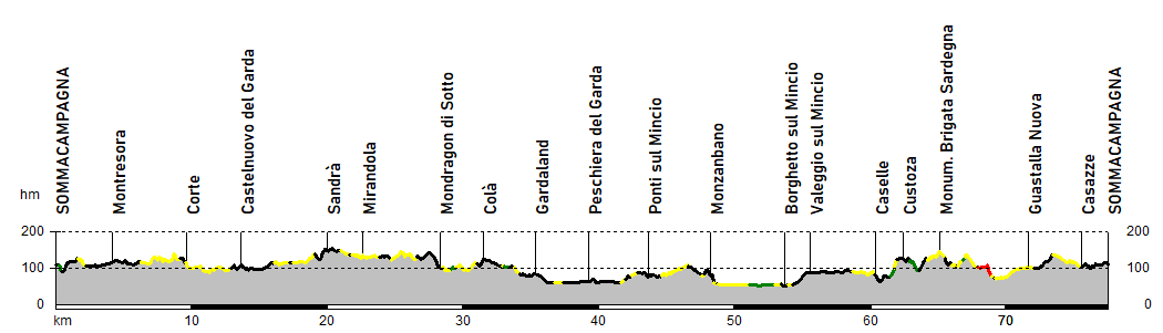 Lasciato il Mincio alle spalle, l’ultima parte del percorso si fa ora più impegnativa: si attraversano infatti le colline moreniche che circondano Custoza, patria dell’omonimo vino bianco. Qui i filari di cipressi si alternano ai vigneti e ai campi coltivati, con le strade che diventano più sconnesse nell’affrontare tre brevi strappi prima del veloce tratto finale che riporta a Sommacampagna, dove si chiude l’anello.