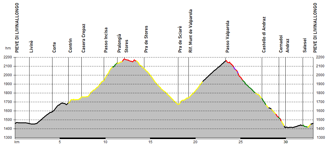 del Falzarego, si scende prima a Cernadoi e poi ad Andraz; per il rientro a Pieve si segue ivnece quasi itneramente la strada principale, abbandonandola per una variante sterrata nei pressi di Salesei.