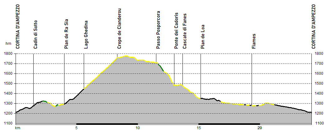 l’itinerario rientra verso Cortina prima sui veloci sterrati di Fiames, quindi sulla comoda ciclabile che segue il tracciato della