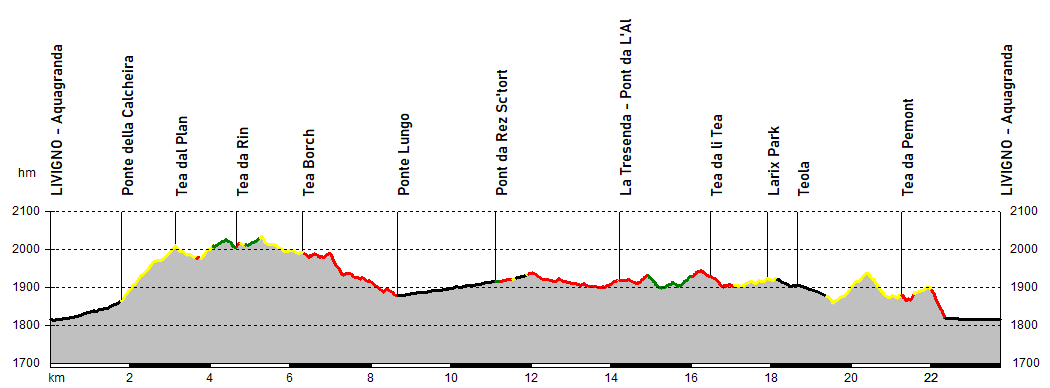 L’itinerario unisce senza troppa fatica le innumerevoli “tee”, le caratteristiche baite in legno che punteggiano la vallata livignasca, sviluppandosi a mezzacosta e offrendo continui panorami su tutta la vallata: nella prima metà il percorso tocca i pendii occidentali della Blesaccia, mentre nel finale – rientrando verso nord – attraversa i boschi ai piedi del Monte della Neve.