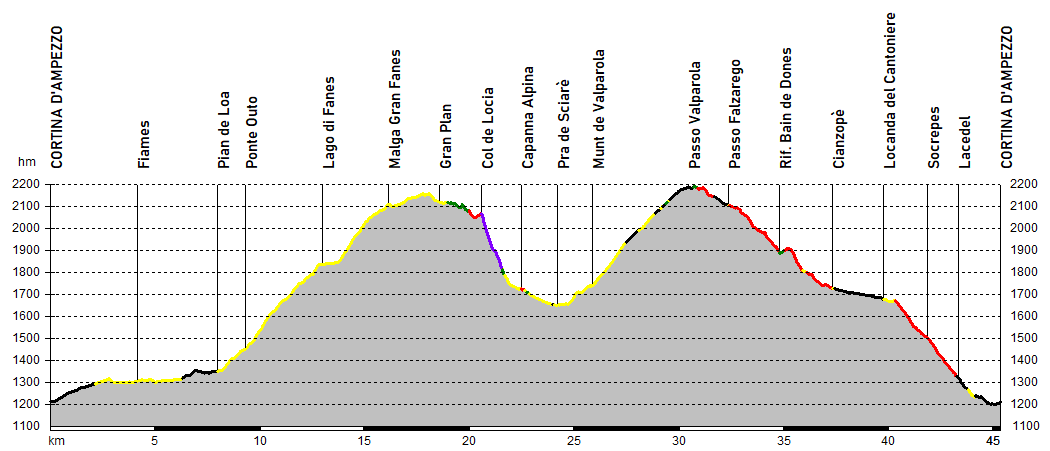 Da Cortina si raggiunge Fiames entrando poi nel parco delle Dolomiti d'Ampezzo, risalendo poi la ripida e talvolta sconnessa salita
