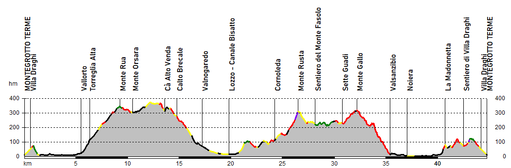 Tra le città più importanti dei Colli Euganei, Montegrotto Terme e Lozzo Atestino sono situate alle due estremità della zona collinare: l’itinerario che si andrà a percorrere unisce idealmente queste due località, con una traversata est-ovest (e ritorno) che andrà a toccare alcuni dei trail più divertenti dei colli centrali.