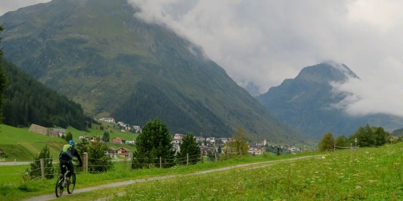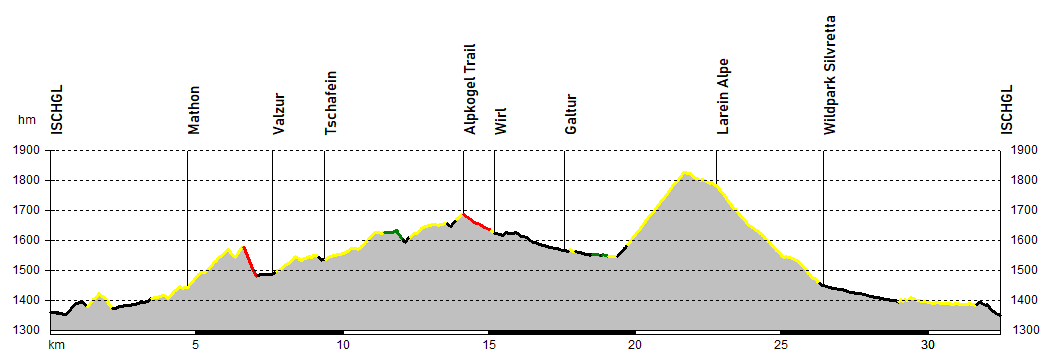 Dal centro di Ischgl si risale il versante nord della valle, aggirando il centro di Mathon con una prima significativa salita seguita dal tecnico single track per Valzur. Continuando poi tra boschi di conifere e pascoli si guadagna gradualmente quota tenendosi alti sopra il paese di Galtur, con il percorso che diventa progressivamente più aperto offrendo frequenti punti panoramici sulla vallata e sulle montagne del Silvretta.