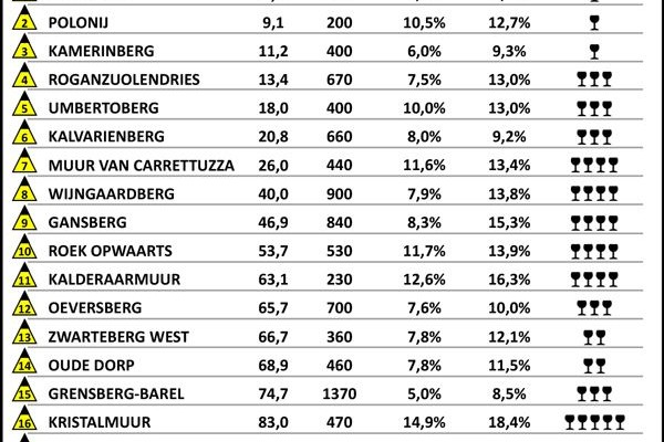 L’avvio è soft sulle colline di Colle Umberto e prosegue ancor più facile nelle pianure della valle del Meschio. A metà percorso iniziano le difficoltà con i muri ai piedi delle Prealpi e successivamente con la sequenza di muri attorno ad Ogliano. Gran finale nei dintorni di Conegliano con i muri finali a difficoltà massima.