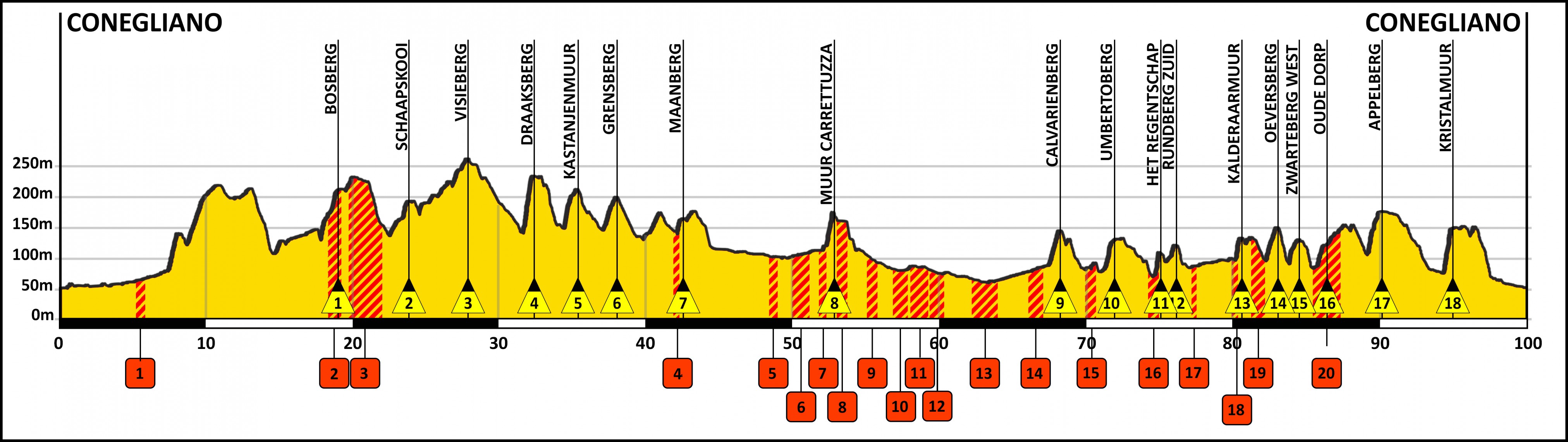 La traccia ufficiale de LA RONDA edizione 2021, la manifestazione ciclistica ispirata alle Classiche del Nord che si svolge ogni anno a Conegliano (TV): il Giro delle Fiandre... a mille chilometri dal Belgio!