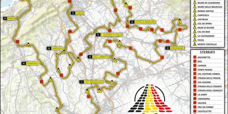 Si comincia con la classica dorsale di Colle Umberto fino a spingersi sui muri ai piedi dele Prealpi. La parte centrale del percorso affronta le classiche di Ogliano per poi raggiugnere Vittorio Veneto e la Valsana: si incontrano qui alcuni dei muri più impegnativi prima di ritornare verso Conegliano ed affrontare l'ultima, temibile rampa del Monte Cristallo.