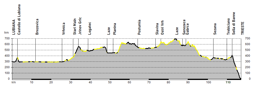 Un ultimo tratto di salita valica quindi Sella di Banne, spartiacque sull’Adriatico, e da qui si plana verso la città di Trieste con pendenze decisamente elevate passando per lo scenografico Belvedere di Conconello, le rotaie del tram di Opicina, i sentieri del parco di Villa Giulia e i sampietrini delle strette viuzze cittadine.