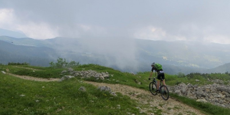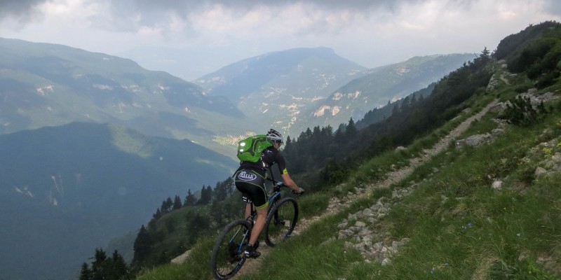 Lasciata la cima si imbocca il meraviglioso single track affacciato sulla val Terragnolo, che tra passaggi arditi e qualche punto tecnico va a innestarsi sulla carrareccia per Passo Coe. Da qui si ritorna al lago Coe, si incrocia il percorso già affrontato e ci si tuffa in veloce discesa nella valle Campoluzzo.