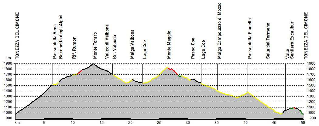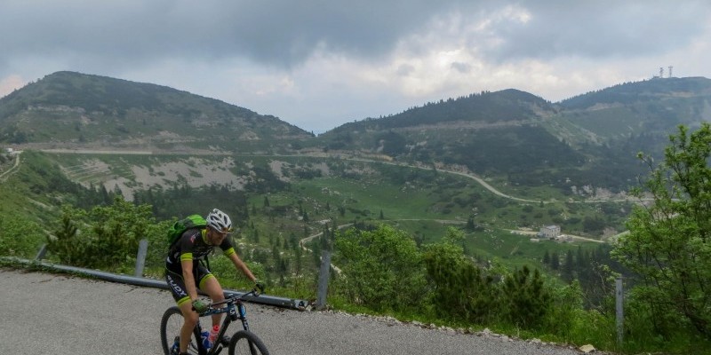 Si comincia con la lunghissima salita al monte Toraro: fino a passo della Vena si percorre la rotabile principale asfaltata, deviando poi sulla strada di arroccamento del monte Melignone. Con pendenze più agevoli si prosegue ora verso il rifugio Rumor, addentrandosi nell'anfiteatro del Campomolon e affrontando lo sconnesso single track verso Forcella Valbona.