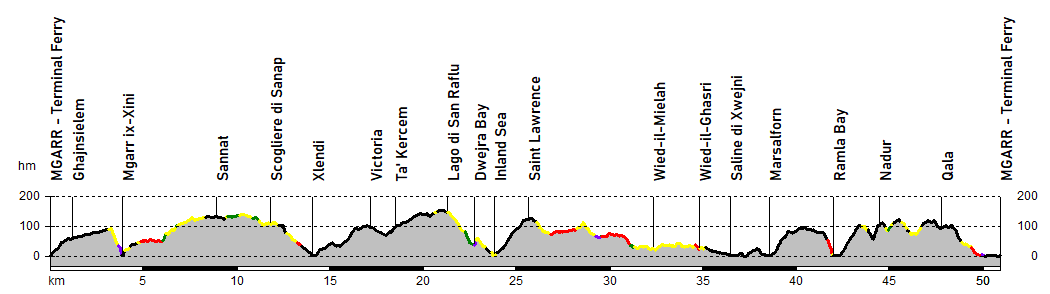 Il periplo dell’isola di Gozo comincia con la salita dal porto di Mgarr a Ghajnsielem, affrontando poi il breve sentiero non ciclabile che scende nella magnifica forra di Mgarr-Ix-Xini. Di nuovo in quota, si seguono le coste più meridionali dell’isola spostandosi poi a Ta’ Cenc passando a pedalare sulla sommità delle imponenti scogliere di Sannat e Sanap.