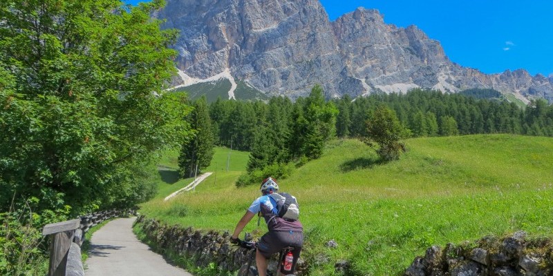 Collocato ai piedi della cresta del monte Pomagagnon e in posizione dominante sulla conca di Cortina, il rifugio Mietres è raggiungibile tramite una scalata non eccessivamente impegnativa che permette – al suo culmine – di godere di uno dei luoghi più belli e soleggiati della valle d’Ampezzo. La discesa che ne segue si rivelerà invece lunga, varia ed estremamente divertente nella successione di sentieri e single track che calano al fondovalle.