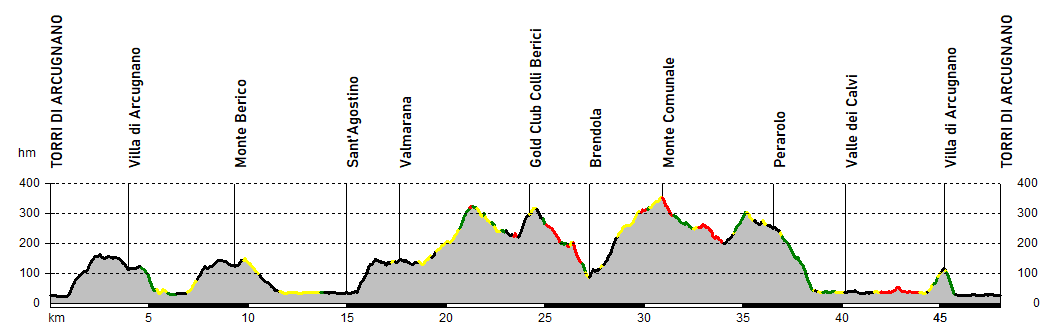 Perarolo e via via più ostici nella disce che riporta a valle. Dopo un lungo tratto pianeggiante l'iterario si chiude invece con il difficile strappo di Villa di Arcugnano, dal fondo particolarmente sconnesso.