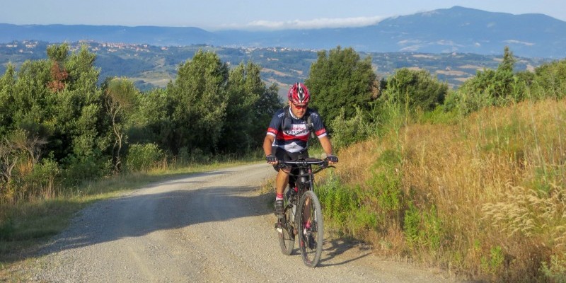 sulle campagne umbro-toscane, con la vista che corre fino alle
