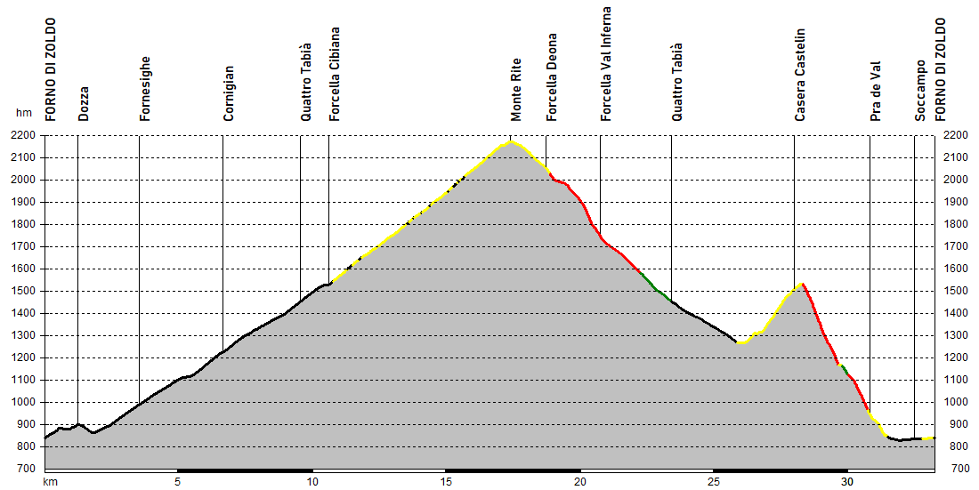 Si parte da Forno di Zoldo andando subito a innestarsi sulla strada che in circa otto chilometri e mezzo raggiunge il passo Cibiana: le pendenze si mantengono sempre tra il 7 e l'8%, con le punte massime che si incontrano prima di Cornigian.