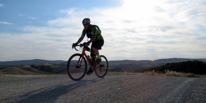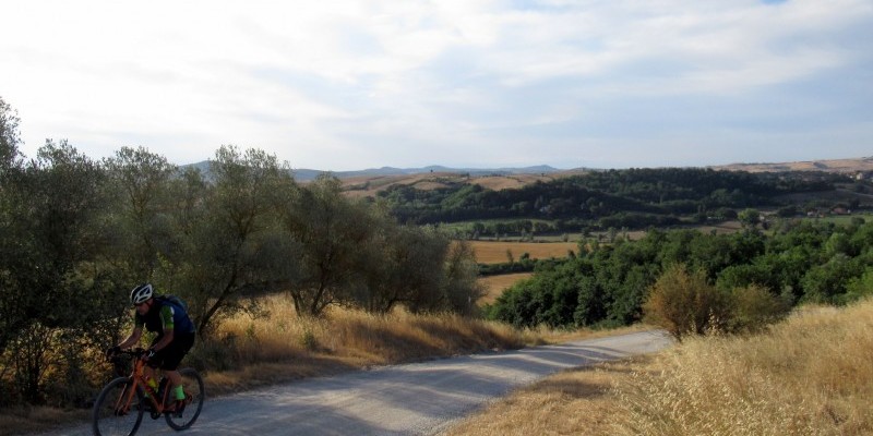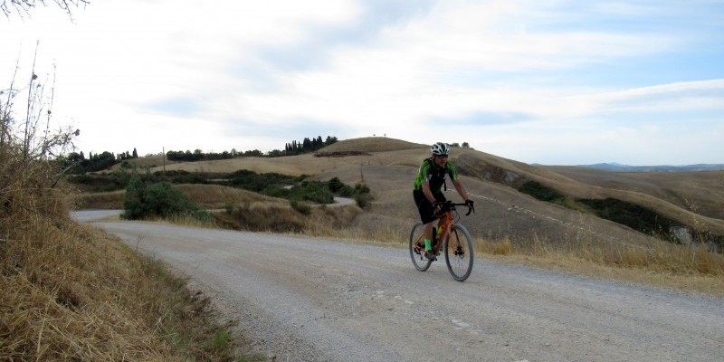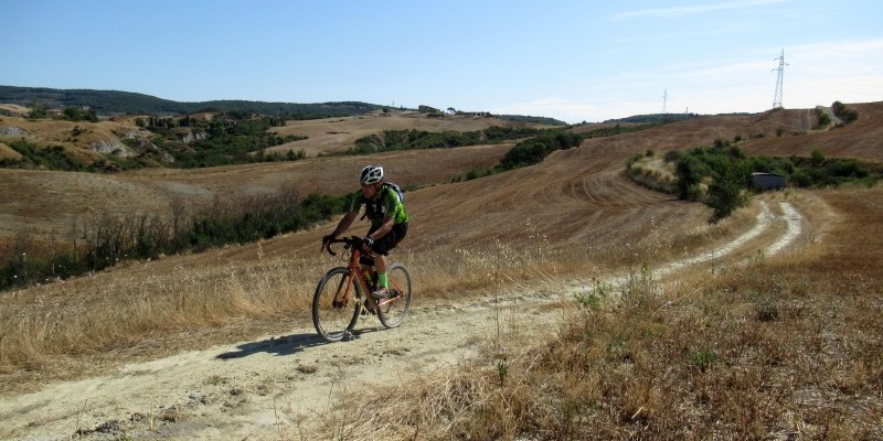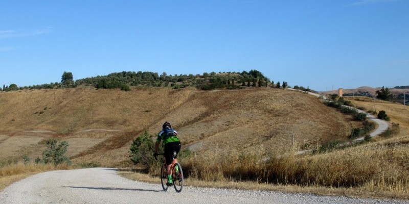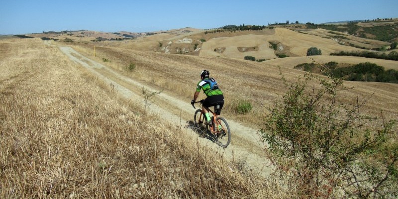 La seconda metà dello sterrato resta invece in quota, in un susseguirsi di saliscendi e curve polverose che offrono scenografiche vedute sulle colline e i calanchi delle Crete Senesi.
