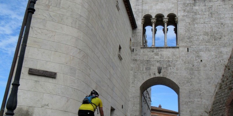 Un ultimo tratto di salita conduce quindi a Torre a Castello, e dopo un breve tratto asfaltato si imbocca la strada di Canapaia che scende dolcemente verso Monteacuto su tratturi polverosi e sconnessi, e qualche improvvisa contropendenza.