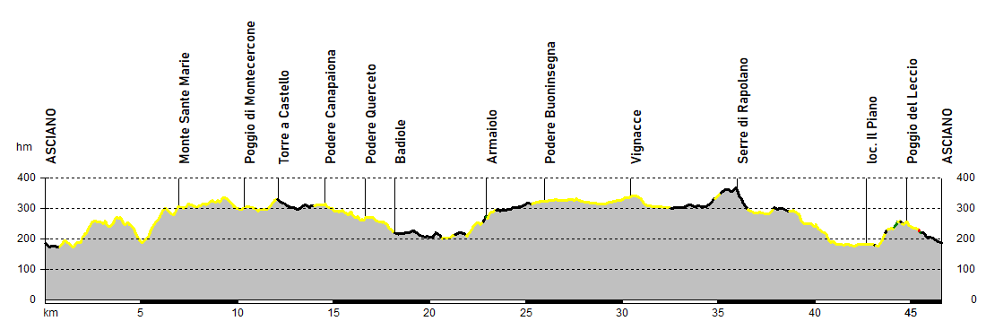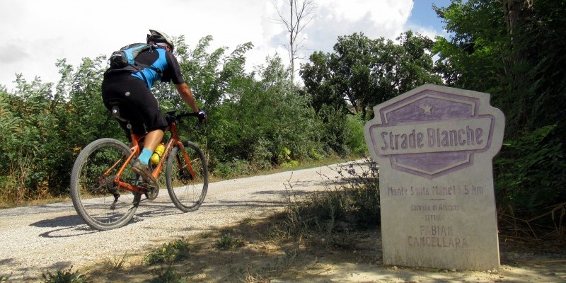 Lo sterro di Monte Sante Marie inizia appena fuori l’abitato di Asciano: gli 11,5 chilometri di strada bianca cominciano con un agevole tratto ondulato al termine del quale si incontra il cippo dedicato a Fabian Cancellara, tre volte vincitore della competizione professionistica e al quale è intitolato questo settore sterrato.