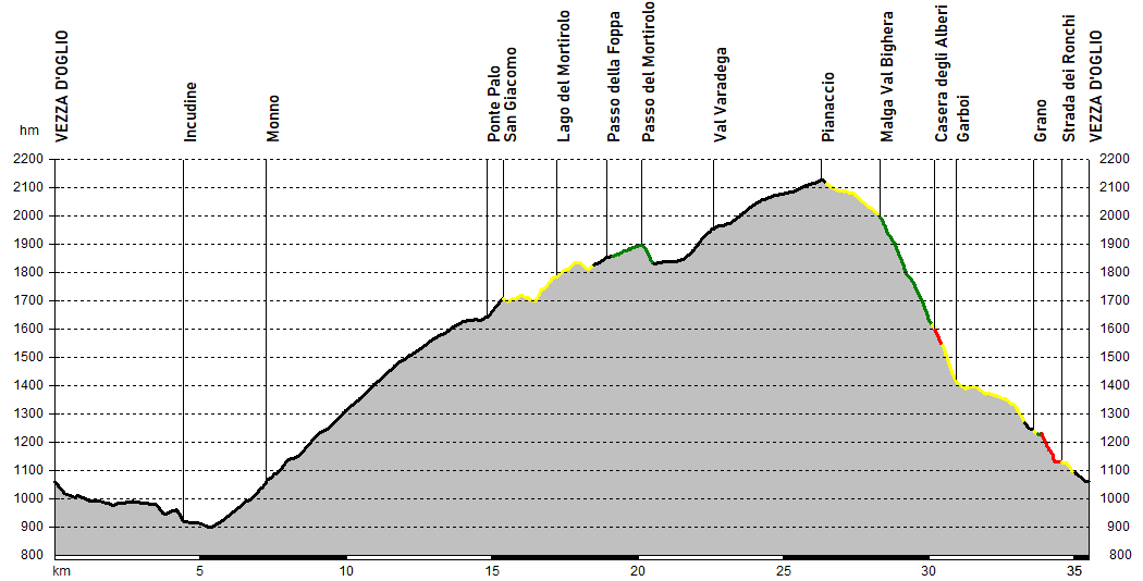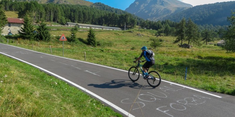 L’itinerario prende il via con i quattro chilometri di pista ciclabile che separano Vezza d’Oglio da Incudine; un ulteriore chilometro sulla statale conduce quindi all’imbocco della salita del Mortirolo.