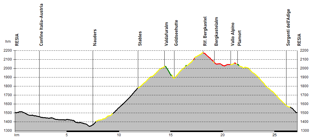 Da Resia si percorre in leggera discesa la ciclabile verso Nauders, dove ha inizio la salita che dopo un primo tratto facile diventa via via più ripida salendo su asfalto verso Stables.