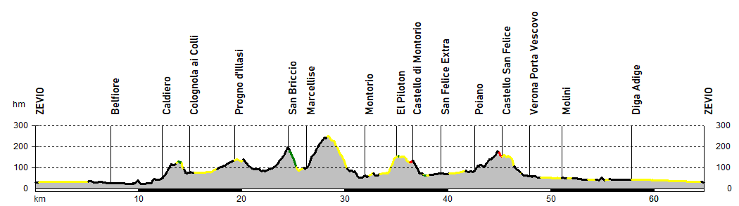 La prima asperità si incontra tra Caldiero e Colognola, andando poi ad attraversare la valle del Progno di Illasi e a raggiungere in salita San Briccio. La successiva discesa su Marcellise è piuttosto sconnessa, con l'asfalto che torna a caratterizzare la terza ascesa.